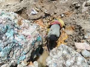 Par ailleurs, il se fait également voir que la mine T17 reste toujours ouverte et envahie par les exploitations minières artisanales. Des bâches érigées en paillotes pour servir d’abris aux côtés des sacs déjà remplis des minerais radioactifs qui attendent l’évacuation. On trouve également des femmes d’autres enceintes. Pendant ce temps, certaines jonchent leurs bébés au sol pendant qu’elles pratiquent l’exploitation artisanale. Des mineurs, même ceux de dix ans, ramassent et entassent les produits miniers dans des petits sceaux.