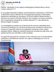 Pourtant la situation a été jugée radioactive et préoccupante dans la province du Lualaba depuis le 23 mars 2026. Le site du remblai T17, situé dans le périmètre d’exploitation de la société KCC devrait être placé en urgence radiologique. Les autorités de la RDC comme Glencore redoutent des conséquences irréparables. C’est principalement sur la santé des populations locales et sur l’environnement.